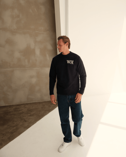 Crafted in a deep navy tone with a soft brushed texture, the Navy WH Crewneck delivers a clean, elevated look. Finished with a bold cream WH chest detail, it’s a modern essential for those who want comfort with a luxury feel.